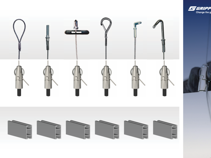 elementy montażowe: aluminiowa szyna (opcjonalnie w wersji anodowanej), wewnętrzene łączniki, śruby oczkowe lub szybkie systemy podwieszeń od Gripple, zaślepki